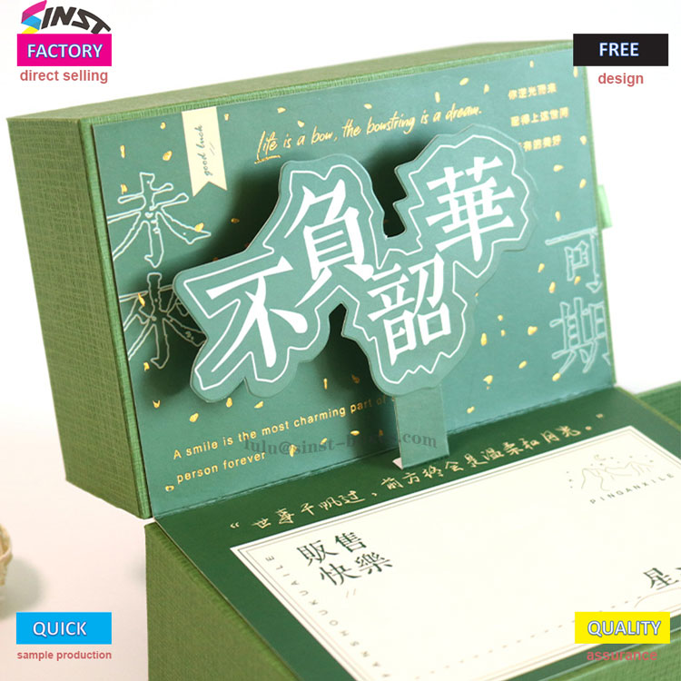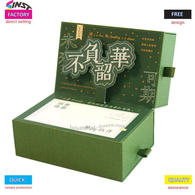 See parfüümi kinkekarp, mida SINST pakendamine ja trükkimine otse müüb, võtab põhitooniks värske rohelise. Sahtli tüüpi karbi korpus on varustatud kolmemõõtmeliste kunstiliste tegelaste ja kuldsete kaunistustega. Parfüümi kinkekarbi külge on kaunistatud "Shao" ja "Qi" ning sisemine padja soon on stabiilne ja lõhnav, mis näitab delikaatsust. Kunstimeele ja rituaalmeele kooseksisteerimine on kvaliteetne valik emotsioonide edasiandmiseks.