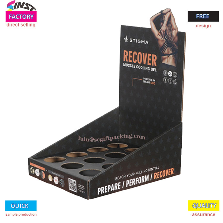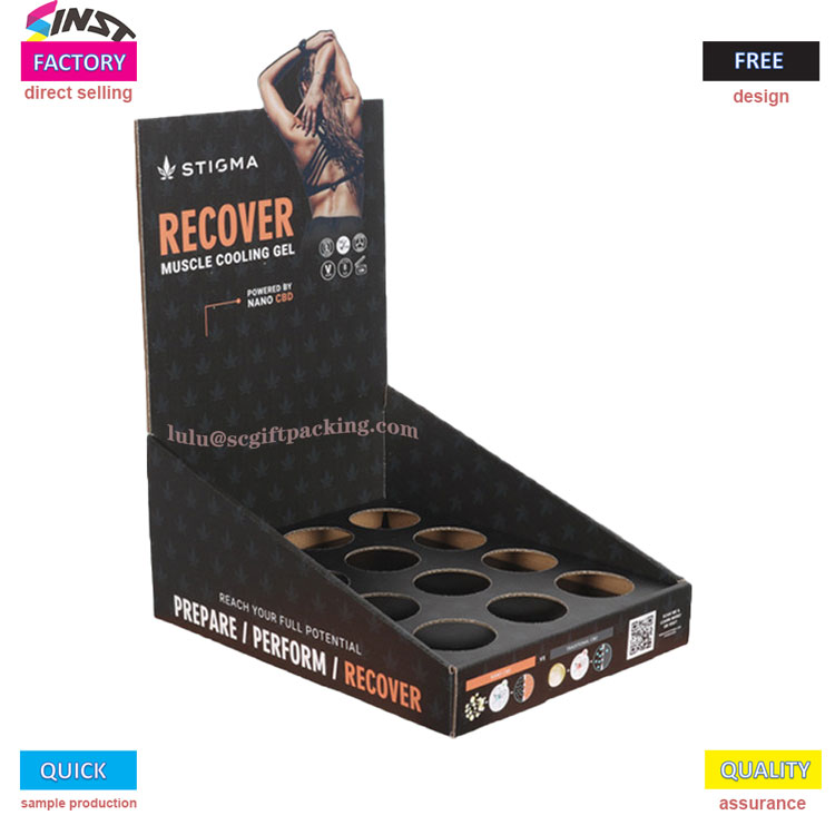 Sellel tühja kosmosepaberiga tervisetoote kuvakarbil on minimalistlik esteetika musta taustaga kuuma tembeldamisega ja võimsa visuaalse efektiga, tuues esile lihaste lõdvestamise põhise müügipunkti pärast treeningut. Kuvaririiul võtab vastu mitme ruudukujulise ümmarguse augu ladustamise kujunduse, mis mitte ainult stabiliseerib kuvari, vaid vabastab ka toodete tekstuuri,