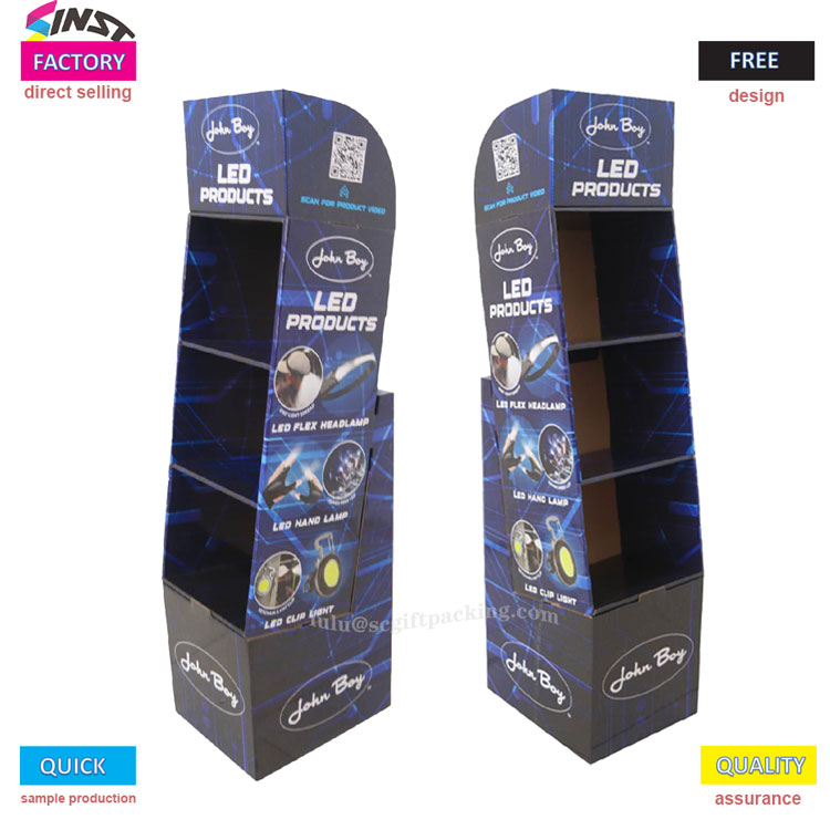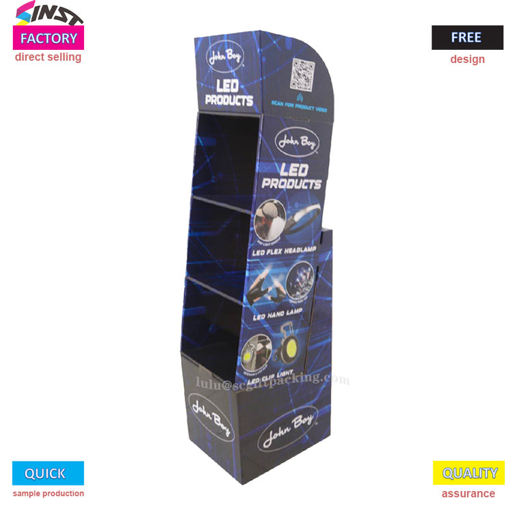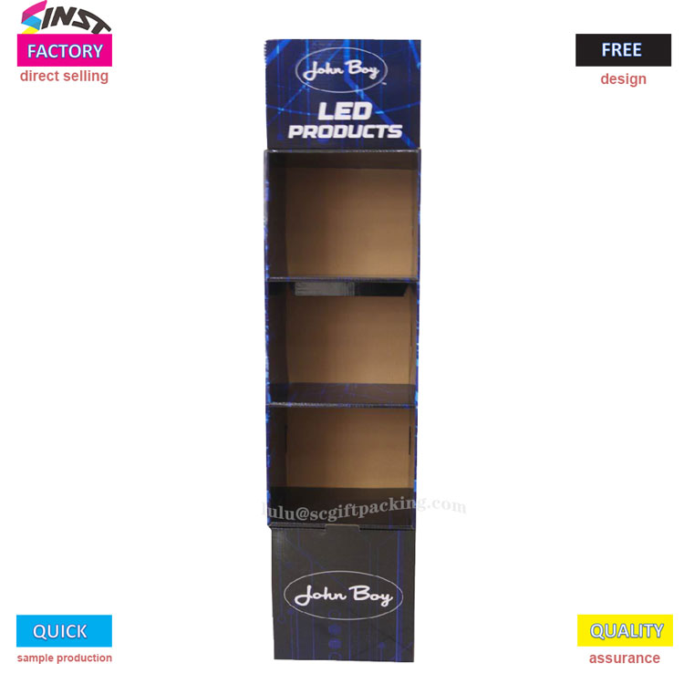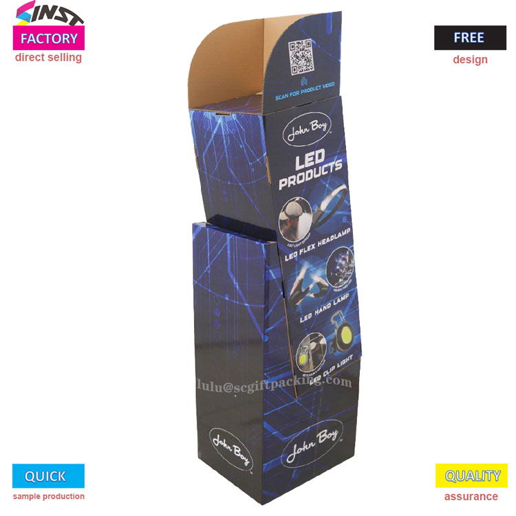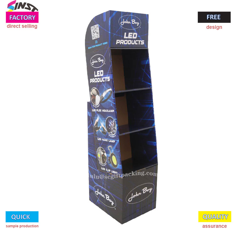 LED -toote lainetatud papist kuvaririiul on sügavsinise peamise värviga sobivate tehnoloogialiinid, vertikaalne ristkülikukujuline struktuur, millel on neli kihti avatud riiulitega, ja trapetsikujulise külje kitseneva disainiga, mis keskendub tootele. Kerge ja vastupidav, sobiv LED -valgustustoodete tõhusaks kuvamiseks jaemüügi stsenaariumide korral.