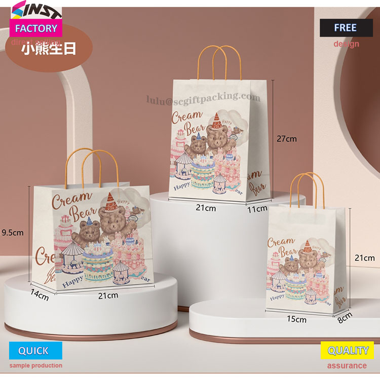 HiljutiSinst Packaging Company käivitas kinkekoti"Karu sünnipäeva" teemaga. Kott on trükitud käsitsi joonistatud koomiksikaru ja koogimustritega, mis on ühendatud sooja kollase käepidemega, mis mitte ainult ei säilita paberkoti keskkonnasõbralikku tekstuuri, vaid edastab ka sünnipäeva atmosfääri erksate värvide kaudu. See kott sobib mitmesuguste kingituste jaoks, näiteks munakoogid, mänguasjad, kinkekarbid jne, olgu see siis perekondlik kogunemine või jaemüügikauplus, see võib vastata põhivajadustele.